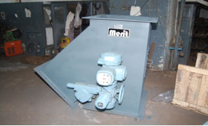 The curved blade design of this diverter gate offers many advantages over the conventional single blade diverter. During closing, the blade will cut through the standing column of material. Hence, there is no jamming or back up problems found in this type of diverting gates. This gate is ideal for diverting coarser dry materials that have a tendency to wedge between the blade and side wall, and plug a chute. The rolling blade design eliminates jamming by having only a thin edge of blade sweeping the side wall. Special cam action of the blade provides excellent sealing capability. The operation is hydraulic, electrical or pneumatic.